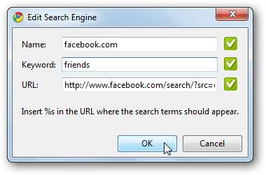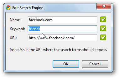 Vous pouvez également modifier les mots clés de recherche existants comme indiqué ci-dessus. Si vous souhaitez modifier la recherche Facebook pour qu'elle apparaisse lorsque vous entrez copains dans votre barre d'adresse, vous pouvez le faire.
