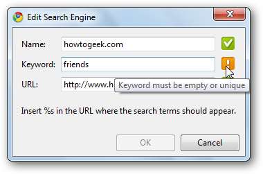 Les mots clés doivent être uniques, mais n'ayez pas peur d'utiliser le même mot clé pour deux sites. Si vous essayez de réutiliser un mot-clé existant, la case à cocher à droite de la boîte de dialogue se transforme en un point d'exclamation jaune indiquant que votre mot-clé doit être unique. Saisissez-en un nouveau, et cela fonctionnera très bien.