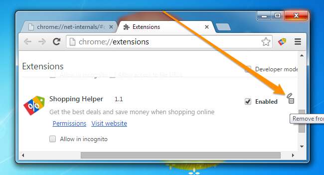Pour supprimer ces extensions, heureusement, c'est aussi simple que de vous diriger vers chrome: // extensions dans votre barre d'adresse (ou d'utiliser le menu principal et d'accéder à Plus d'outils, puis à Extensions), puis de cliquer sur l'icône Supprimer de la corbeille Chrome.