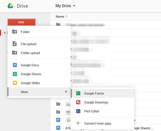 Pour commencer, connectez-vous à votre Compte Google Drive , cliquez sur Nouveau, pointez sur Plus et sélectionnez Google Forms. Vous pouvez également commencer à partir de la page Web Google Forms , en cliquant sur le lien Créer un formulaire libre.