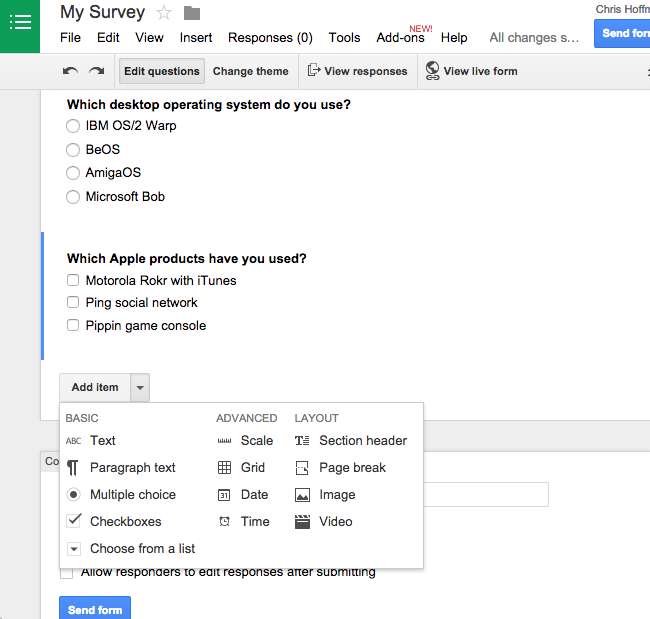 Vous pouvez continuer à ajouter autant de questions que vous le souhaitez avec le bouton Ajouter un élément. Vous pouvez demander à l'utilisateur de sélectionner un élément dans une liste, de cocher autant d'éléments qu'il le souhaite ou de taper une réponse dans une petite zone de texte, de saisir un paragraphe dans une zone de texte plus grande.