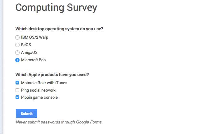 Pour prévisualiser votre enquête, cliquez sur le bouton «Afficher le formulaire en direct» en haut du document. Le formulaire est hébergé sur le site Web de Google, tout comme les fichiers Googel Docs partagés, mais il est interactif. Vous ne pouvez pas masquer l'avertissement "Ne jamais soumettre de mots de passe via Google Forms", qui permet de garantir hameçonneurs ne peut pas créer de fausses boîtes de dialogue de connexion convaincantes et inciter les gens à soumettre leur mot de passe Google.
