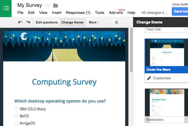 Vous pouvez également générer vos réponses dans une feuille de calcul, ce qui vous permet de faire beaucoup plus avec les données. Lors de la modification du formulaire, cliquez sur Réponses> Choisir la destination de la réponse. Vous pourrez créer une nouvelle feuille de calcul ou une nouvelle feuille dans un fichier de feuille de calcul existant. Lorsque quelqu'un soumet de nouvelles réponses via votre formulaire, les données sont saisies directement dans la feuille de calcul. Lorsque vous associez un formulaire à une feuille de calcul, toutes les réponses précédemment envoyées seront directement envoyées vers cette feuille de calcul, vous n'avez donc pas à craindre de perdre des données.