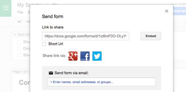 Vous avez maintenant une enquête, mais vous devez fournir un lien vers d'autres personnes afin qu'elles puissent la remplir. Cliquez simplement sur le bouton Envoyer le formulaire dans le coin supérieur droit de la page et vous obtiendrez une URL. Cette URL est une adresse publique. Quiconque le visite peut remplir votre formulaire. Vous pouvez envoyer ce lien par e-mail à diverses personnes, le partager sur les réseaux sociaux, l'envoyer par SMS ou message instantané, le publier sur un site Web ou faire tout ce que vous voulez avec.