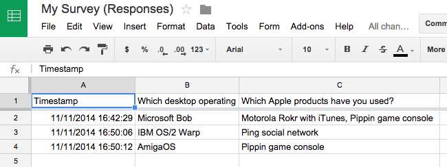 La feuille de calcul peut fonctionner comme une simple liste des réponses que vous recevez. Vous pouvez également utiliser tous les outils classiques de manipulation de feuilles de calcul et d'analyse de données pour travailler avec les données.