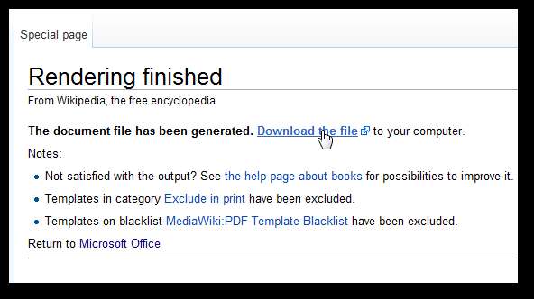 Après quelques instants, Wikipédia ouvrira une nouvelle page vous informant que votre nouveau document a été généré. Clique le Téléchargez le fichier lien pour afficher le PDF directement dans votre navigateur, ou cliquez avec le bouton droit et sélectionnez Enregistrer sous pour l'enregistrer sur votre ordinateur comme d'habitude.