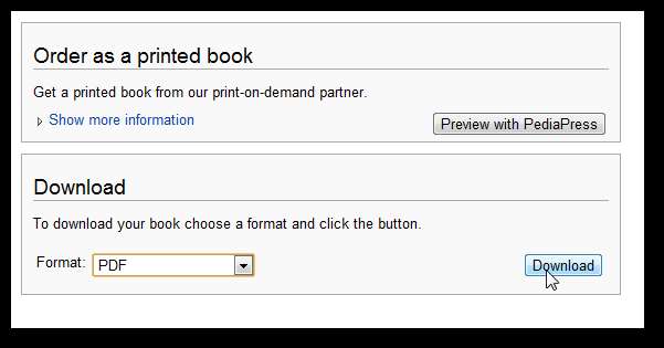 Une fois que vous avez terminé, vous pouvez choisir de télécharger votre eBook sous forme de document au format PDF ou ODT, ou commander une copie imprimée de votre eBook Wikipedia auprès de PediaPress.