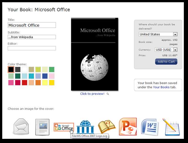 Comme mentionné ci-dessus, vous pouvez également choisir d'acheter votre livre Wikipédia imprimé auprès de PediaPress. Si vous choisissez cette option, vous serez redirigé vers le site PediaPress où vous pourrez sélectionner une couleur de couverture et une image parmi les articles inclus.