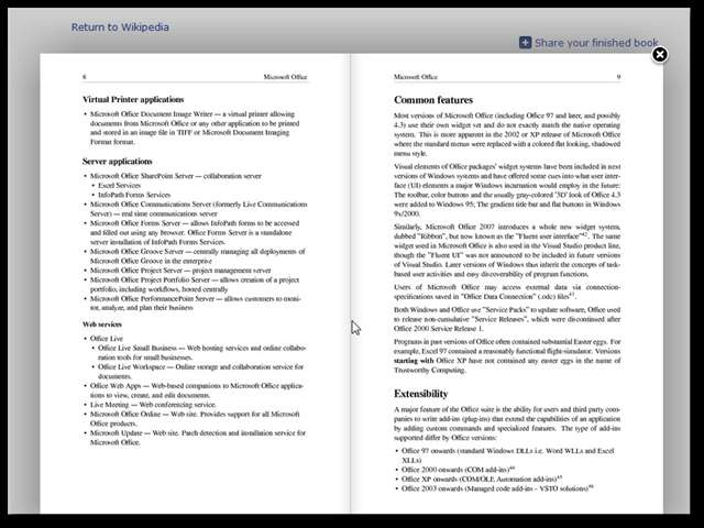 Les eBooks Wikipédia se révèlent assez bien et incluent des tableaux, de nombreuses images et des liens de l'article original, le tout présenté dans un joli format de livre. Vous pouvez maintenant lire et partager votre eBook depuis votre ordinateur, l'imprimer ou le transférer sur une liseuse pour lire votre livre Wikipédia en déplacement.