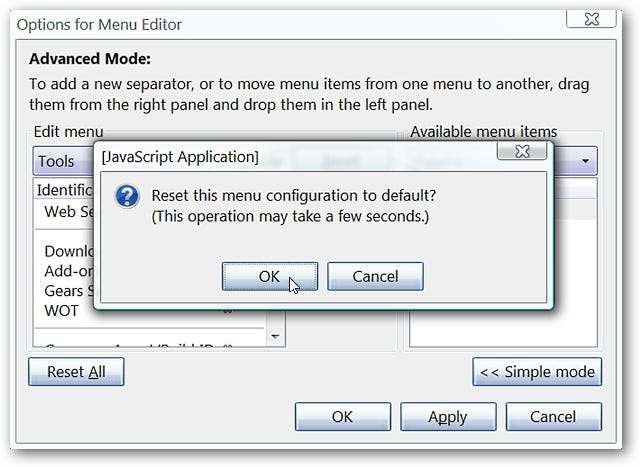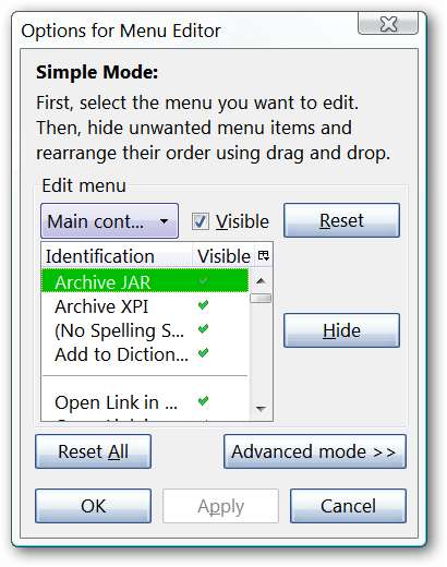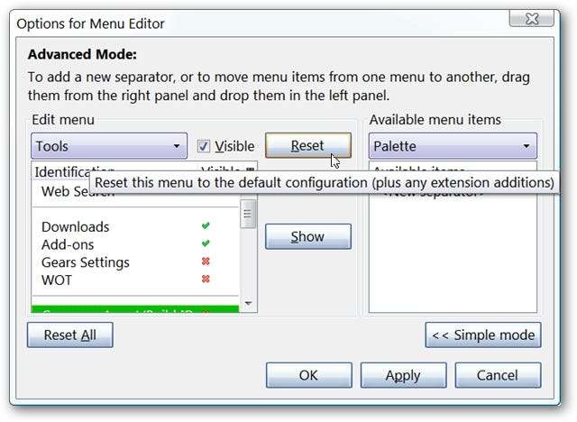 Il s'agit du «Mode avancé»… à partir de là, vous devrez choisir le menu particulier que vous souhaitez modifier. Notez qu'il existe des boutons «Reset & Reset All».