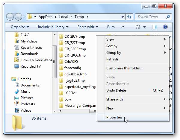 Le dossier Temp s'ouvre… cliquez avec le bouton droit sur une zone vide du dossier et sélectionnez Propriétés.
