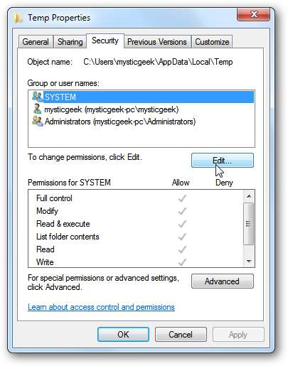 Sélectionnez l'onglet Sécurité et sous la zone Noms de groupes ou d'utilisateurs, cliquez sur Modifier.