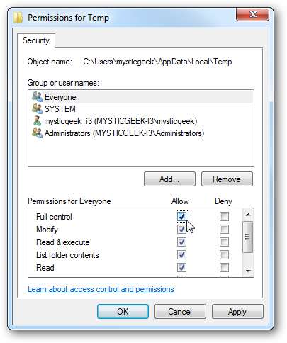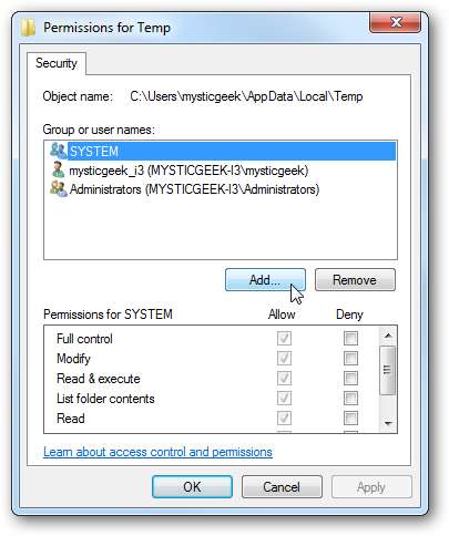 La fenêtre Autorisations pour Temp s'affiche… cliquez sur le bouton Ajouter.