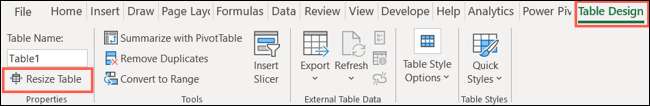 Sélectionnez une cellule dans la table. Allez à l'onglet de conception de la table qui apparaît et cliquez sur "Redimensionner la table" sur le côté gauche du ruban.