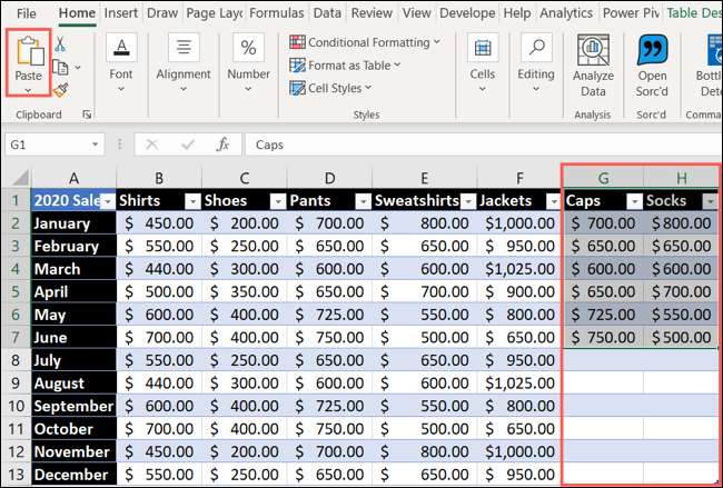 Comme la frappe dans la cellule, vous pouvez également coller des données. Donc, si vous avez des données d'un autre emplacement sur votre presse-papiers, dirigez-vous vers la cellule située à droite de la dernière colonne ou sous la dernière ligne et collez-la. Vous pouvez utiliser "Coller" sur l'onglet Home ou cliquez avec le bouton droit de la souris et sélectionnez "Coller".