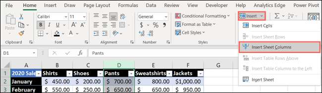- Sélectionnez une colonne ou une ligne, accédez à l'onglet Home, puis cliquez sur «Insérer» dans la section des cellules du ruban. Vous pouvez également cliquer sur la flèche en regard du bouton Insertion et choisissez "Insérer des colonnes de feuille" ou "Insérer des lignes de feuille". Les deux options inséraient une colonne à gauche ou dans la ligne ci-dessus.