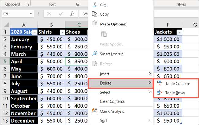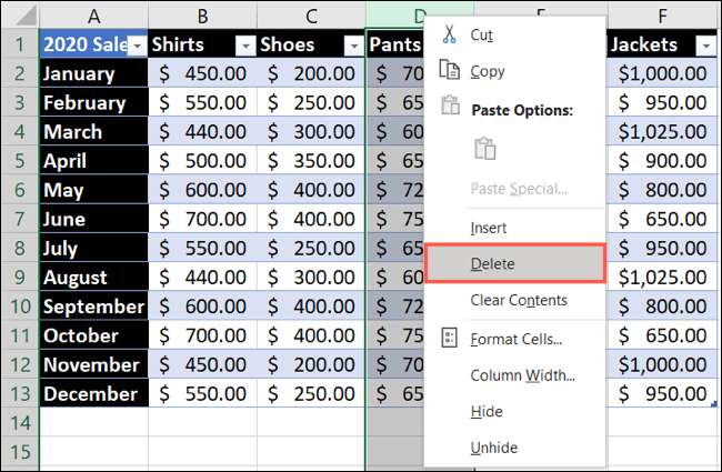 Comme l'ajout de colonnes ou de lignes à une table dans Microsoft Excel, les supprimer est aussi simple. Et comme vous avez probablement déjà deviné, il y a plus d'une façon de le faire! Ici, vous utiliserez simplement la fonction Supprimer.