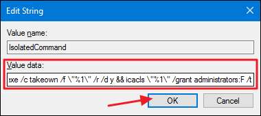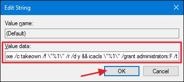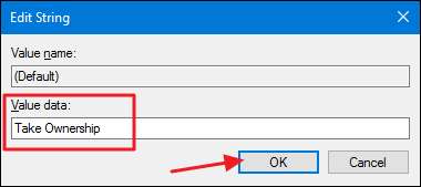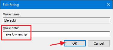 Dans la fenêtre des propriétés, tapez "Prendre possession" dans la zone "Données de la valeur", puis cliquez sur "OK". La valeur que vous tapez ici deviendra la commande que vous voyez dans votre menu contextuel, alors n'hésitez pas à la changer pour ce que vous voulez.