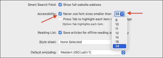 Si vous changez d'avis plus tard et que vous souhaitez que la plus petite forme de police, cliquez sur "Safari" dans la barre de menus et accédez à Préférences & GT; Avancé, puis décochez la case "Ne jamais utiliser la taille de la police inférieure à". Alternativement, vous pouvez simplement sélectionner une taille de police plus petite dans le menu.