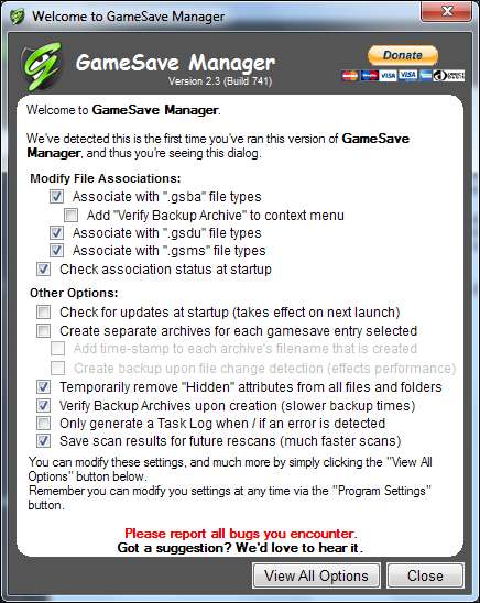 Après avoir installé et lancé GameSave Manager, vous verrez une fenêtre de bienvenue. Vous pouvez modifier les options ici si vous le souhaitez, mais les paramètres par défaut devraient convenir.
