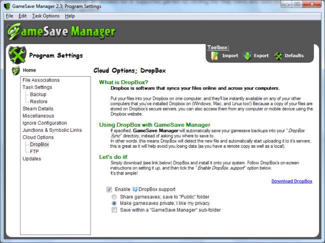 Si vous ne souhaitez pas associer vos parties sauvegardées, vous pouvez simplement les sauvegarder dans votre répertoire Dropbox normalement. Clique le " Paramètres du programme », Accédez à la section Dropbox sous Options Cloud et activez la prise en charge de Dropbox. GameSave Manager peut également sauvegarder sur un serveur FTP.