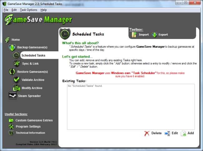 Utilisez le " Tâches planifiées »Pour sauvegarder automatiquement vos parties sauvegardées à intervalles réguliers. Cette fonctionnalité crée une nouvelle tâche dans le planificateur de tâches Windows, de sorte que GameSave Manager n’a pas besoin d’être ouvert en arrière-plan.