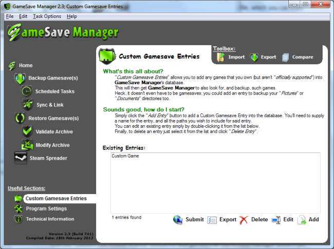 Utilisez le " Entrées Gamesave personnalisées »Pour ajouter des jeux que GameSave Manager ne prend pas encore en charge. Clique le " Ajouter »Et vous serez invité à entrer un nom pour le jeu, l'emplacement de ses fichiers de sauvegarde et même l'emplacement des entrées de registre dont il peut avoir besoin. Une fois le travail terminé, vous pouvez cliquer sur le bouton " Soumettre »Et les développeurs de GameSave Manager l'envisageront d'être inclus dans la prochaine mise à jour de la base de données.