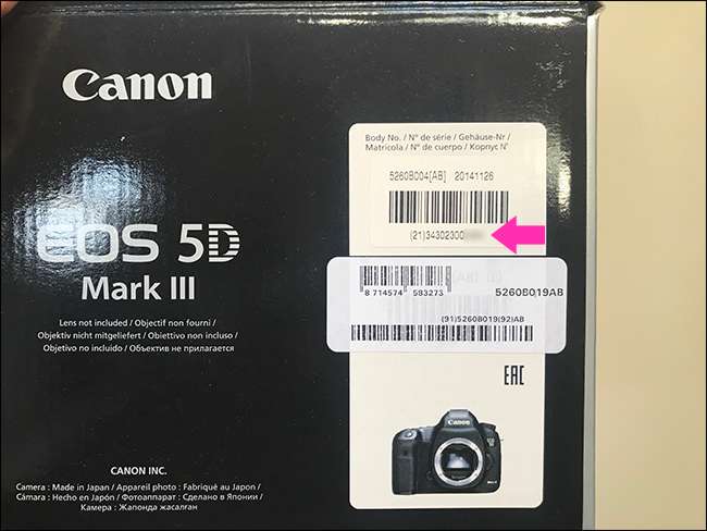 Retirez toutes les boîtes qu'il vous reste et cherchez un autocollant. Il indiquera très probablement quelque chose comme «Non», «N ° du corps», «S / N», ou autre. Voici celui pour ma caméra.