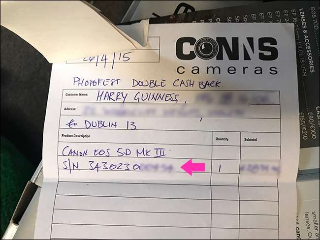 Si vous ne trouvez pas la boîte, recherchez le reçu. Mon magasin d'appareils photo préféré est old school, donc ils ont écrit à la main le numéro de série. La plupart des endroits l'imprimeront.