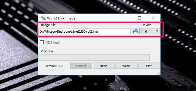 Avec votre carte effacée toujours insérée dans votre PC, ouvrez à nouveau Win32 Disk Imager. Cette fois, cliquez sur le dossier bleu et accédez à votre image enregistrée. Choisissez votre carte SD dans la liste déroulante de la même manière que vous l'avez fait auparavant.