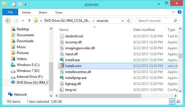 Tout d'abord, recherchez le fichier Install.wim, qui est stocké sur le support d'installation de Windows. Si vous disposez d'un disque physique, insérez-le dans votre ordinateur. Si vous avez un fichier ISO, vous pouvez le «monter» sous Windows 8 en double-cliquant dessus dans l'Explorateur de fichiers.