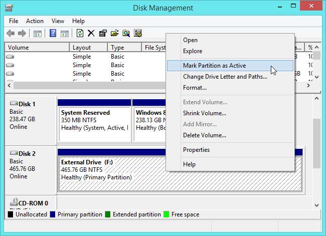 Localisez le lecteur externe dans la liste, cliquez avec le bouton droit sur la partition sur laquelle vous avez créé une image du système Windows To Go et sélectionnez Marquer la partition comme active. Cela marquera cette partition comme la partition amorçable «active» sur ce disque externe.