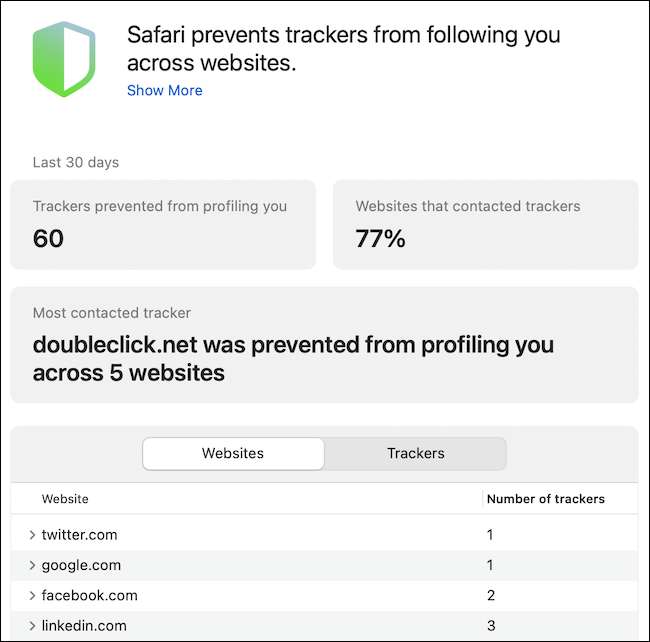 "Rapport de la vie privée" montre une exécution des sites Web que vous avez visités au cours des sept derniers jours et rapporte combien de suiveurs ont été bloqués du profilage de votre présence sur le Web. Vous pouvez cliquer sur le rapport et afficher exactement quels suiveurs sur chaque site Web ont été bloqués.