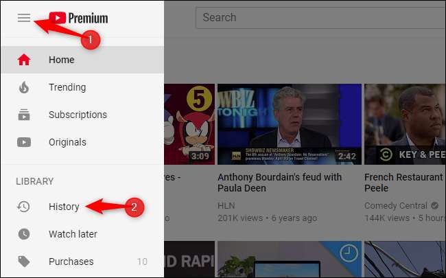 Pour ce faire dans votre navigateur Web, accédez au Site Web YouTube et cliquez sur le bouton de menu dans le coin supérieur gauche de la page. Clique le " Histoire »Sous Bibliothèque dans la barre latérale.