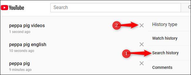 Vous pouvez également sélectionner "Historique des recherches" ici pour voir la liste complète des recherches que vous avez effectuées sur YouTube. Cliquez sur le «X» à droite d'une recherche pour la supprimer.