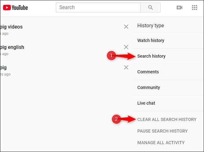 Vous pouvez également sélectionner «Historique des recherches» ici et cliquer sur «Suspendre l'historique des recherches» pour empêcher YouTube de se souvenir des recherches que vous effectuez.