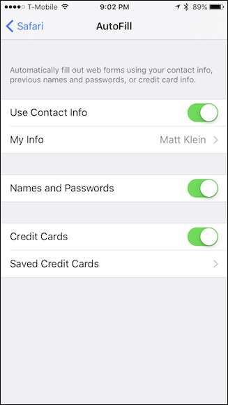 Sous iOS, les options sont légèrement différentes de celles de macOS. Vous pouvez toujours désactiver vos coordonnées, noms et mots de passe et cartes de crédit, mais il n'y a pas d'option pour les autres formulaires.