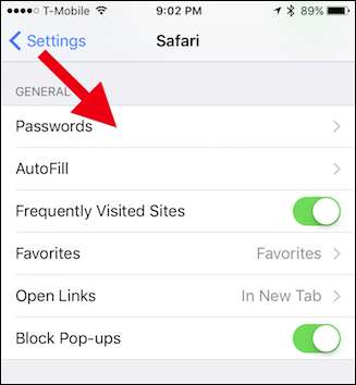 Vous avez peut-être remarqué, dans la capture d'écran précédente, qu'il n'existe aucun moyen évident de modifier les informations de connexion enregistrées. Pour corriger les noms d'utilisateur et les mots de passe stockés, appuyez de nouveau sur les paramètres Safari, puis appuyez sur «Mots de passe» juste au-dessus des paramètres de saisie automatique.