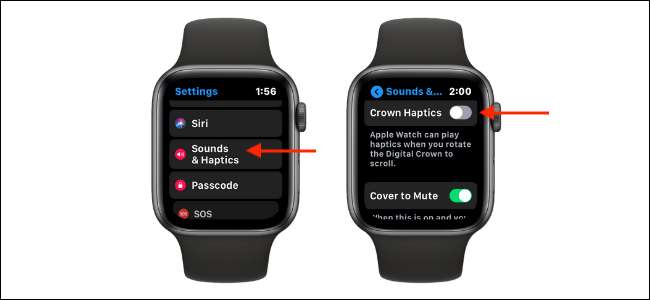 Ensuite, faites défiler et appuyez sur «Sounds & Amp; Option Haptics ". Ici, sélectionnez la bascule à côté de "Crown Haptics" pour désactiver la fonctionnalité.