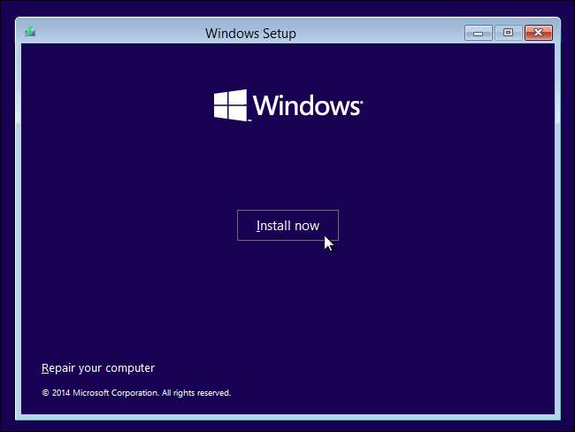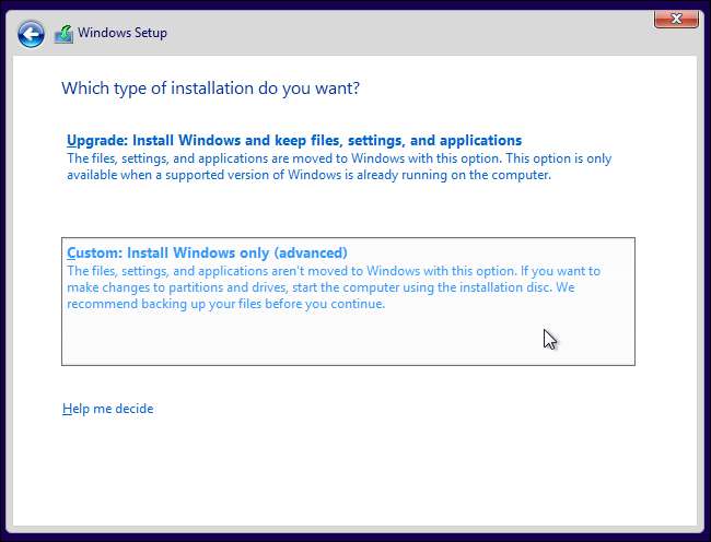 Après avoir accepté le contrat de licence, cliquez sur l'option d'installation «Personnalisé: Installer Windows uniquement (avancé)». La mise à niveau mettrait à niveau votre système Windows 7 ou 8 existant vers l'aperçu technique de Windows 10. Personnalisé vous permet d'installer Windows 10 avec une copie existante de Windows.