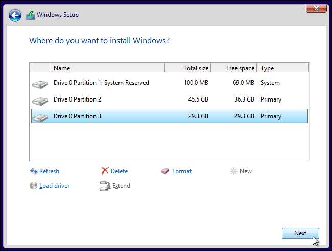 Le programme d'installation de Windows créera une nouvelle partition et la sélectionnera pour vous. Cliquez sur Suivant pour installer Windows 10 sur cette nouvelle partition