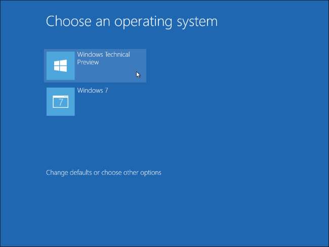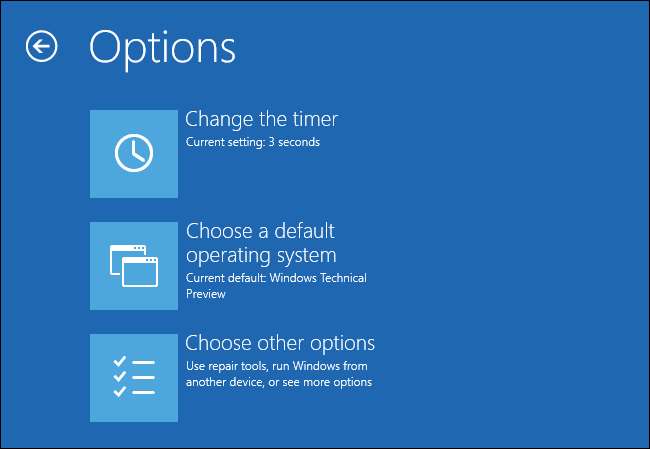 Cliquez sur le lien «Modifier les paramètres par défaut ou choisir d'autres options» sur cet écran pour modifier les options. À partir de là, vous pouvez choisir le système d'exploitation Windows que vous souhaitez démarrer par défaut et contrôler la durée pendant laquelle la sélection du système d'exploitation apparaîtra avant de démarrer automatiquement cette version par défaut de Windows.