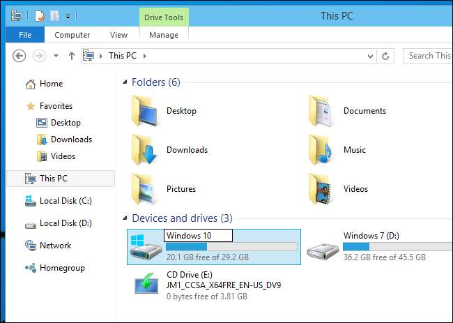 Les deux versions de Windows utilisent le système de fichiers NTFS, de sorte que vous pouvez facilement accéder à vos fichiers à partir de la version de Windows que vous utilisez. Vous verrez votre autre lecteur Windows apparaître avec sa propre lettre de lecteur dans l'Explorateur de fichiers ou l'Explorateur Windows. Vous pouvez cliquer avec le bouton droit sur un lecteur et sélectionner Renommer pour lui donner une étiquette plus descriptive, comme «Windows 10» ou «Windows 7».