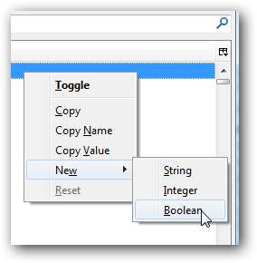 Type about: config dans la barre d'adresse, puis après avoir cliqué sur l'avertissement, vous devrez cliquer avec le bouton droit de la souris dans la liste et choisir Nouveau -> Booléen dans le menu.