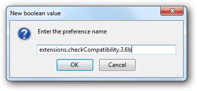 Nous allons maintenant être invité à entrer le nom de la préférence. C'est là que vous devez faire attention à la version exacte que vous utilisez, car la préférence doit être définie pour la version exacte de Firefox que vous utilisez.