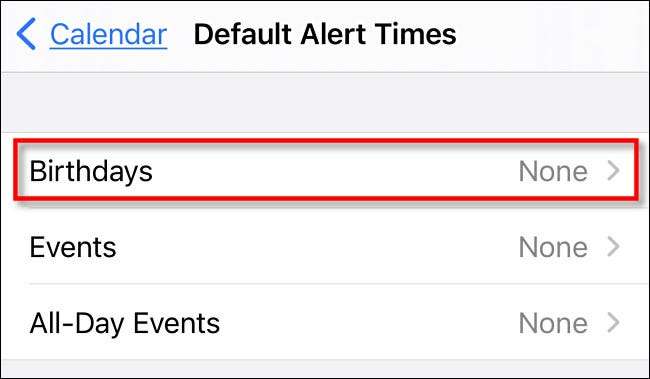Dans "Temps d'alerte par défaut", sélectionnez "Anniversaires".