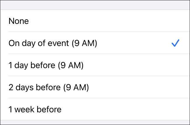 Sur l'écran "Anniversaires", vous pouvez choisir un moment où Calendar vous alertera des anniversaires à venir. Vous pouvez choisir "le jour de l'événement", "1 jour avant", "2 jours avant," ou "1 semaine avant." Pour les trois premiers de ces choix, le calendrier vous informera à 9 heures le jour de votre sélection.