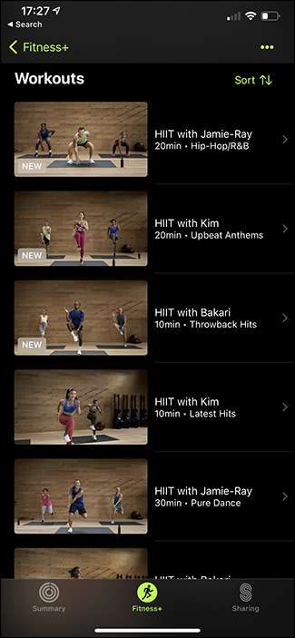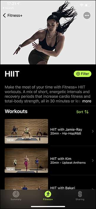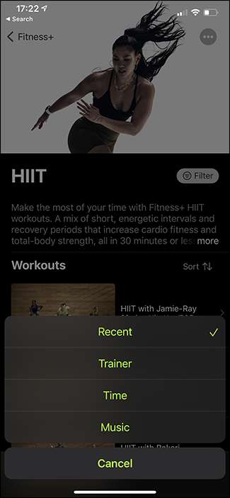 [dix]En haut de l'écran Fitness + sur votre iPhone ou iPad, vous verrez une liste des différentes catégories d'entraînement. Appuyez sur une pour voir une longue liste des options disponibles. Vous pouvez appuyer sur "Tri" pour trier la liste, mais le meilleur moyen de le faire est de taper "filtrer". Ensuite, vous pouvez filtrer les différentes classes par "entraîneur", "temps" ou "musique".