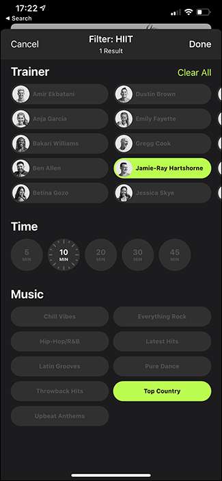 C'est une façon pratique de trouver exactement quelle classe vous voulez. Par exemple, j'ai pu trouver rapidement une classe Hiit de 10 minutes avec une playlist de première campagne (Nice One, Jamie-Ray).