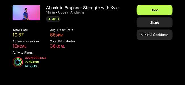 [dix] Après avoir terminé une séance d'entraînement, vous verrez un résumé de la performance de la façon dont vous avez fait. Si vous aimez une séance d'entraînement et que vous souhaitez le sauvegarder dans vos favoris, appuyez sur "Ajouter". [dix] Vous pouvez également appuyer sur "Partager" pour partager une séance d'entraînement (pas vos statistiques) avec un ami. Ou appuyez sur "Mindful Cooldown" pour faire une courte séance d'étirement et de méditation. [dix]